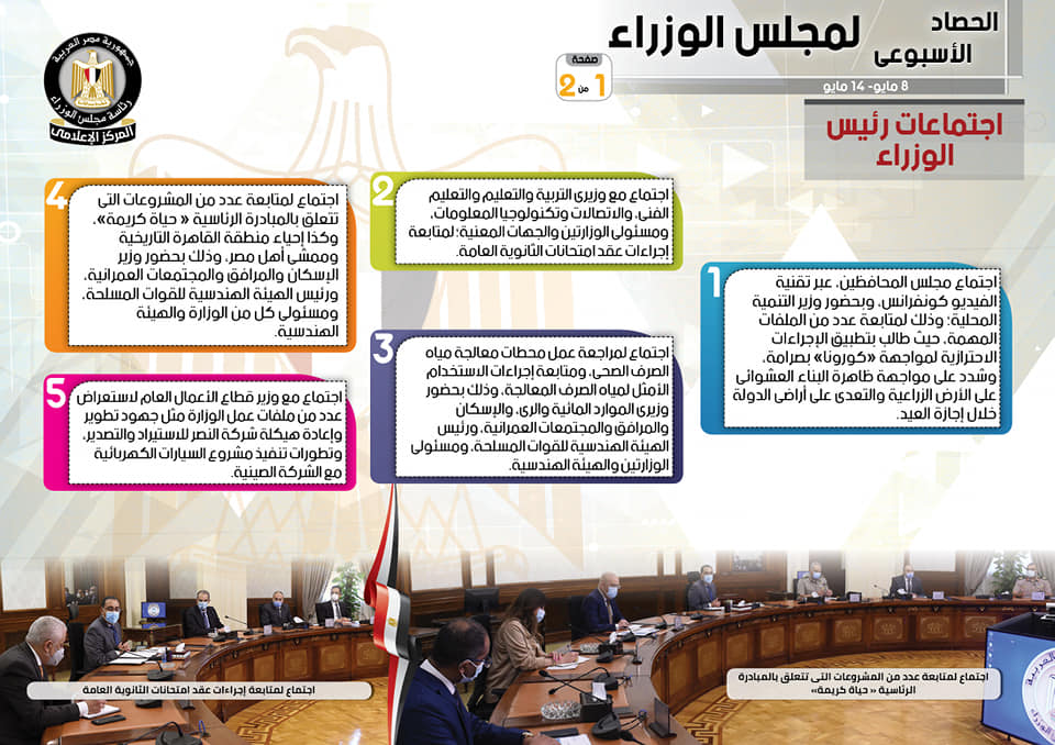 نشر المركز الإعلامي لمجلس الوزراء، تقريرا شمل انفوجرافات سلط من خلالها الضوء على الحصاد الأسبوعي لمجلس الوزراء، وذلك خلال الفترة من 8 حتى 14 مايو 2021، والذي تضمن الاجتماعات واللقاءات التي عقدها الدكتور مصطفى مدبولي، رئيس مجلس الوزراء، بالإضافة إلى ما قام به من أنشطة.