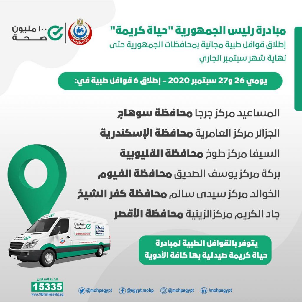 إطلاق ٦ قوافل طبية ضمن مبادرة رئيس الجمهورية #حياة_كريمة يومي ٢٦ و٢٧ سبتمبر للكشف والعلاج مجانًا في التخصصات الطبية ( نساء وولادة – خدمات تنظيم الأسرة – الباطنة – الأطفال – الأنف والأذن – العظام – الجراحة – الرمد – الأسنان – القلب – الجلدية – خدمات الأشعة والتحاليل) بمحافظات ( سوهاج – الإسكندرية – القليوبية – الفيوم – كفر الشيخ – الأقصر) ..