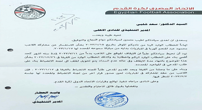 “إيماءا للخطاب الوارد إلينا من ناديكم الموقر بتاريخ 15 يناير 2023 بشأن الاستفسار عن مشاركة اللاعب محمود عبد المنعم كهربا في المباريات بداية من مباراة سموحة المحدد لها 17 يناير 2023، ونود أن نحيط سيادتكم علما أن الإيقاف الموقع على اللاعب بدءا من 11 يوليو 2022 لمدة ستة أشهر كحد أقصى بناء على الخطاب الوارد إليكم وإخطارنا به وكذلك الخطاب الوارد من فيفا في 26 ديسمبر 2022 بشأن هذا الموضوع بانتهاء مدة الإيقاف وفي حالة عدم السداد يتم تحويل الملف إلى لجنة الانضباط بناء على طلب المدعي في المواعيد المحددة”.