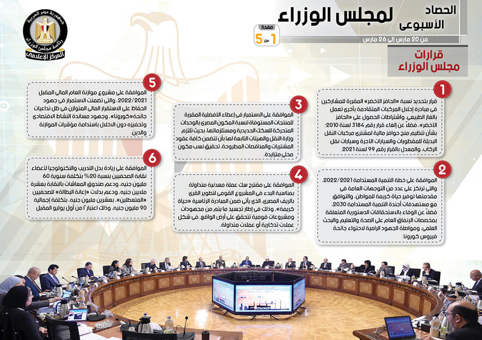 الإنفوجراف.. الحصاد الأسبوعي لمجلس الوزراء خلال الفترة من20 مارس إلى 26 مارس 2021