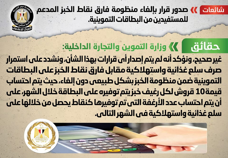 انتشر في بعض المواقع الإلكترونية وصفحات التواصل الاجتماعي أنباء بشأن صدور قرار بإلغاء منظومة فارق نقاط الخبز المدعم للمستفيدين من البطاقات التموينية، وقد قام المركز الإعلامي لمجلس الوزراء بالتواصل مع وزارة التموين والتجارة الداخلية، والتي نفت تلك الأنباء، مُؤكدةً أنه لا صحة لإلغاء منظومة فارق نقاط الخبز المدعم للمستفيدين من البطاقات التموينية، وأنه لم يتم إصدار أي قرارات بهذا الشأن، مُشددةً على استمرار صرف سلع غذائية واستهلاكية مقابل فارق نقاط الخبز على البطاقات التموينية ضمن منظومة الخبز بشكل طبيعي دون إلغاء، حيث يتم احتساب قيمة 10 قروش لكل رغيف خبز يتم توفيره على البطاقة خلال الشهر، على أن يتم احتساب عدد الأرغفة التي تم توفيرها كنقاط يحصل من خلالها على سلع غذائية واستهلاكية في الشهر التالي.