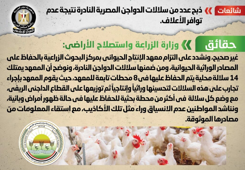 وقد قام المركز الإعلامي لمجلس الوزراء بالتواصل مع وزارة الزراعة واستصلاح الأراضي، والتي نفت تلك الأنباء، مُؤكدةً أنه لا صحة لذبح عدد من سلالات الدواجن المصرية النادرة نتيجة عدم توافر الأعلاف، مُشددةً على التزام معهد الإنتاج الحيواني بمركز البحوث الزراعية بالحفاظ على المصادر الوراثية الحيوانية، ومن ضمنها سلالات الدواجن النادرة، موضحةً أن المعهد يمتلك 14 سلالة محلية يتم الحفاظ عليها في 8 محطات تابعة للمعهد، حيث يقوم المعهد بإجراء تجارب على هذه السلالات لتحسينها وراثياً وإنتاجياً، ثم توزيعها على القطاع الداجني الريفي، مع وضع كل سلالة في أكثر من محطة بحثية للحفاظ عليها في حالة ظهور أمراض وبائية، مُناشدةً المواطنين عدم الانسياق وراء مثل تلك الأكاذيب، مع استقاء المعلومات من مصادرها الموثوقة.