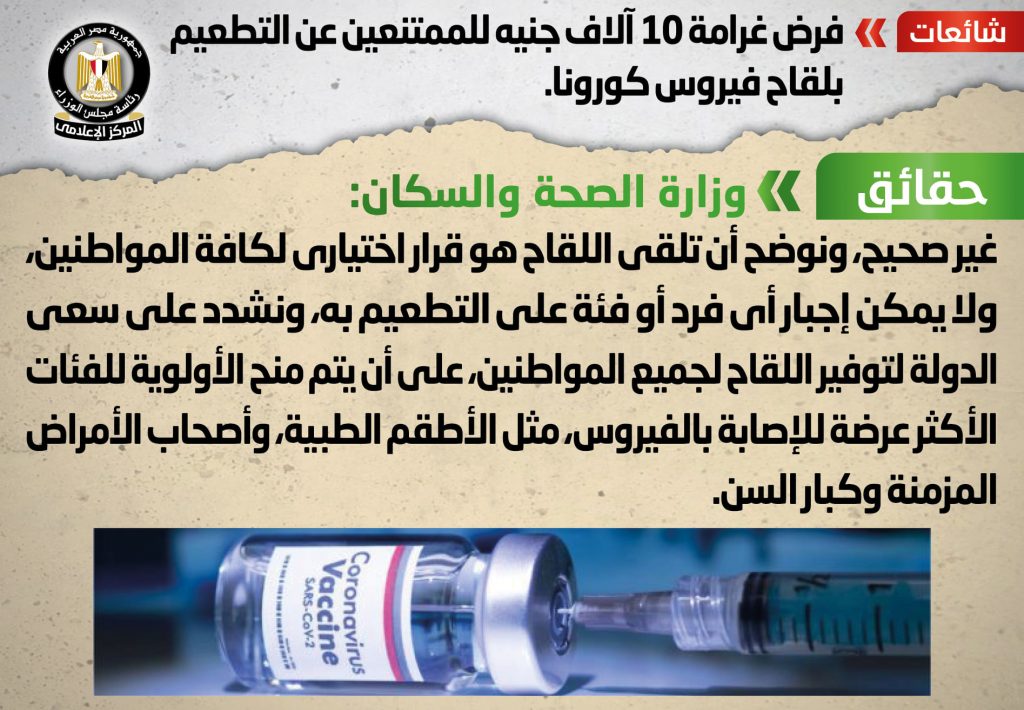 وانتشر في بعض المواقع الإلكترونية وصفحات التواصل الاجتماعي، أنباء بشأن فرض غرامة 10 آلاف جنيه للممتنعين عن التطعيم بلقاح فيروس كورونا ، وقد قام المركز الإعلامي لمجلس الوزراء بالتواصل مع وزارة الصحة والسكان، والتي نفت تلك الأنباء.