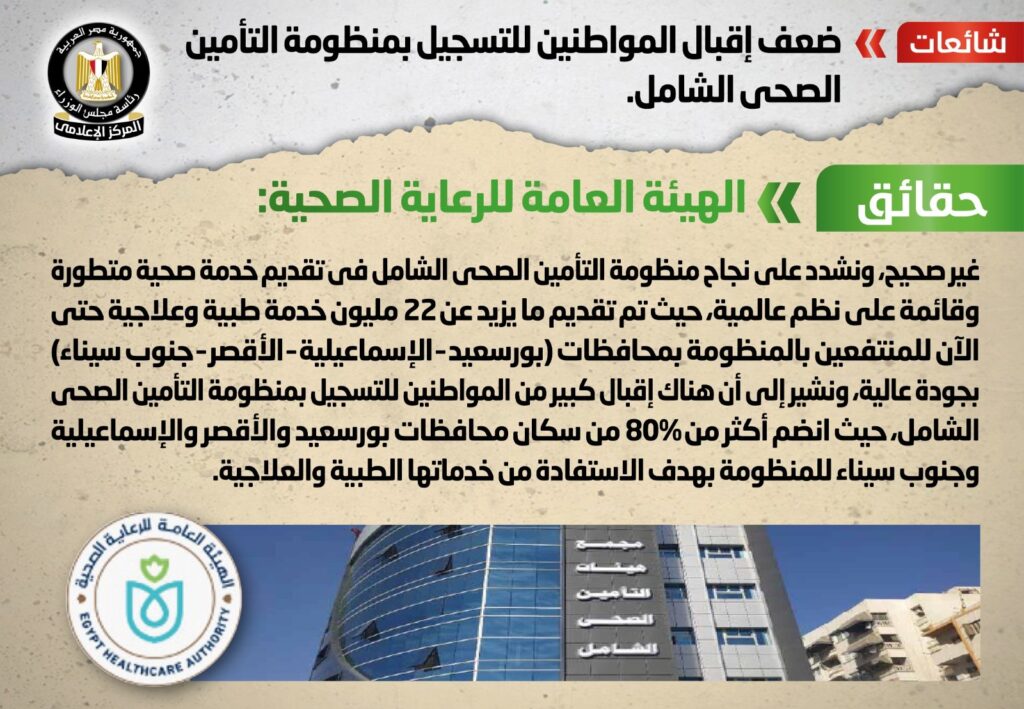 نفي المركز الإعلامي لمجلس الوزراء ما انتشر من أنباء بشأن ضعف إقبال المواطنين للتسجيل بمنظومة التأمين الصحي الشامل.