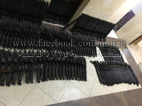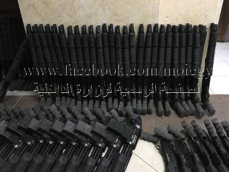 واسفر تفتيش السيارتين عن ضبط مخزن سرى أسفل صندوق إحداهما وتبين أن بداخله 20 بندقية نمساوى الصنع ماركة **STEYR AUG** عيار 5,56 × 45 مم مثبت بكل منها جهاز تليسكوب وخزينة و صندوق بداخلهم عدد 31 ألف طلقة من ذات العيار و4 سلاح متعدد و1 تليسكوب ليلى .*