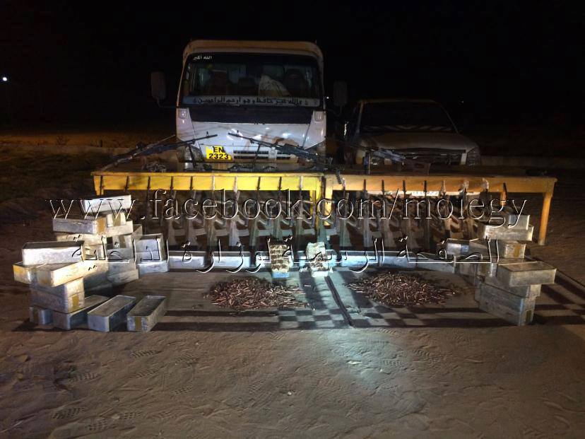 كما توافرت أيضاً معلومات لقطاع الأمن الوطنى تفيد إضطلاع أحد العناصر الإرهابية بالإعداد لتهريب شحنة أسلحة أخرى من أحدالمخازن الواقعة بمحافظة بنى سويف إلى شمال سيناء تمهيداً لإستخدامها فى تنفيذ مخططاتهم العدائية فتم التعامل الفورى مع تلك المعلومات فى الإطار القانونى بالتنسيق مع أجهزة الوزارة وأسفر ذلك عن ضبط السيارة المعنية بالمعلومات بنطاق مركز الواسطى/محافظة بنى سويف وقائدها حيث تم ضبط السيارة رقم ” و ف ج 4937 ” ماركة تويوتا بيك أب بيضاء اللون قيادة أيمن أحمد محمد فواز ( مواليد 10 / 7 / 1971 بنى سويف ويقيم بها قرية تزمنت الغربية – عاطل ) وأسفر تفتيش السيارة عن ضبط مخزن سرى أسفل صندوقها وتبين أن بداخله 190 بندقية خرطوش **PUMPACTION**” سعة 5 طلقات ماركة “بيونتر ،توماهوك”و٩٢ خزينة طلقات خاصة ببندقية خرطوش و24 لفافة كبيرة الحجم لمخدر الحشيش و لفافة صغيرة الحجم لمخدر الحشيش.*