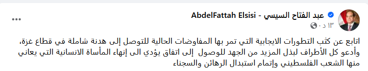 وتابع عبر صفحته الرسمية على موقع التواصل الاجتماعي فيسبوك: “أدعو كل الأطراف لبذل المزيد من الجهد للوصول إلى اتفاق يؤدي إلى إنهاء المأساة الإنسانية التي يعاني منها الشعب الفلسطيني وإتمام استبدال الرهائن والسجناء”.