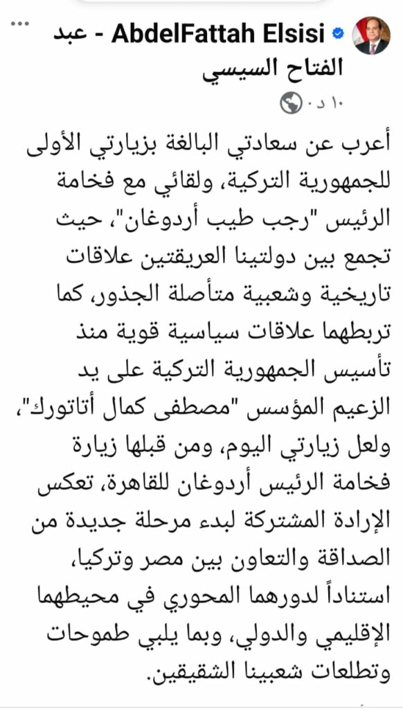 وتابع الرئيس السيسي، فى تدوينة له على موقع التواصل الاجتماعي: “تجمع بين دولتينا العريقتين علاقات تاريخية وشعبية متأصلة الجذور، كما تربطهما علاقات سياسية قوية منذ تأسيس الجمهورية التركية على يد الزعيم المؤسس “مصطفى كمال أتاتورك”، ولعل زيارتي اليوم، ومن قبلها زيارة فخامة الرئيس أردوغان للقاهرة، تعكس الإرادة المشتركة لبدء مرحلة جديدة من الصداقة والتعاون بين مصر وتركيا، استناداً لدورهما المحوري في محيطهما الإقليمي والدولي، وبما يلبي طموحات وتطلعات شعبينا الشقيقين”.