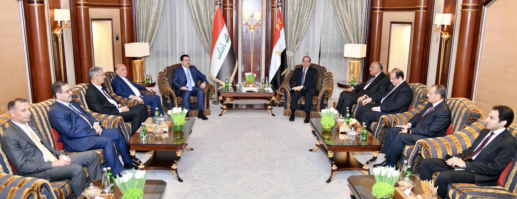 ومن جانبه ، أكد محمد شياع السوداني على تقدير بلاده للجهود المصرية الداعمة للشأن العراقي على كافة الأصعدة، والتطلع لتعزيز أطر التعاون مع مصر، سواء على المستوى الثنائي أو في إطار آلية التعاون الثلاثي مع الأردن، وذلك للاستفادة من تجربة النجاح المصرية الملهمة على صعيد بناء مؤسسات الدولة وتحقيق التنمية المستدامة والمشروعات القومية ونقلها إلى العراق، خاصةً في مجال البنية التحتية والطاقة الكهربائية، فضلاً عن تعزيز مجالات التعاون الاقتصادي والتجاري والاستثماري، مع تثمين الدور المصري الداعم للعراق، والذي يمثل عمقاً استراتيجياً لبلاده على المستوين الإقليمي والدولي، لا سيما فيما يتعلق بمواجهة التحديات المشتركة، وعلى رأسها مكافحة الإرهاب وتحقيق الأمن والاستقرار والتنمية.