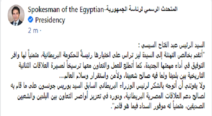 تقدم الرئيس عبد الفتاح السيسي بخالص التهنئة إلى السيدة ليز تراس على اختيارها رئيسةً للحكومة البريطانية.