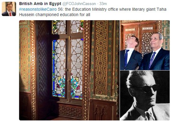 أبدى جون كاسن السفير البريطانى بالقاهرة، إعجابه بمكتب وزارة التربية والتعليم، وإدراجها ضمن الأسباب التى جعلته يحب القاهرة، معلقاً على نضال الأديب العملاق الراحل طه حسين، لمنح حق التعليم المجانى للجميع. وقال كاسن فى تغريدة له عبر حسابه الرسمى على موقع التدوين المصغر تويتر “مكتب وزارة التعليم، حيث دافع عملاق الأدب طه حسين عن إتاحة التعليم الجميع، ومنحه بصورة مجانية”. ونشر السفير البريطانى عبر حسابه صوراً من داخل المكتب، وصورة له برفقة الدكتور الهلالى الشربينى وزير التربية والتعليم والتعليم الفنى، ولم يستطع كاسن إخفاء إعجابه بتصميم المكتب وزخرفته.