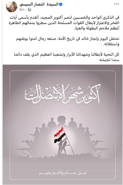 وقالت السيدة انتصار السيسي عبر صفحتها الرسمية بموقع التواصل الاجتماعي “فيس بوك”:”في الذكرى الواحد والخمسين لنصر أكتوبر المجيد، أتقدم بأسمى آيات الفخر والاعتزاز لأبطال القوات المسلحة الذين سطروا بدمائهم الطاهرة أعظم ملاحم البطولة والعزة”، مضيفة:”نحتفل اليوم بإنجاز خالد في تاريخ الأمة، صنعه رجال آمنوا بوطنهم واستقلاله.. كل التحية لأبطالنا وشهدائنا الأبرار ولشعبنا العظيم الذي يقف دائما سندا لجيشه”.