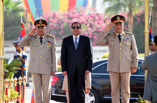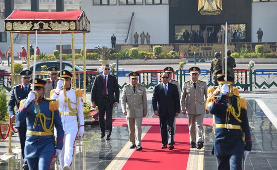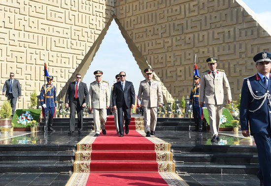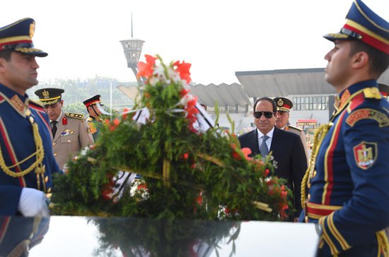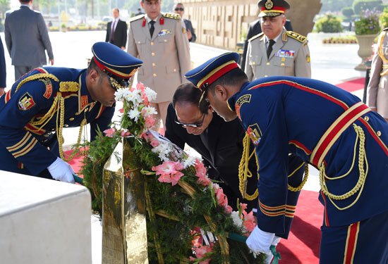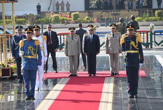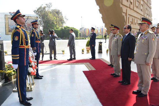 بمناسبة احتفالات مصر والقوات المسلحة بالذكرى الرابعة والثلاثين لتحرير سيناء الحبيبة، قام الرئيس عبد الفتاح السيسي رئيس الجمهورية القائد الأعلى للقوات المسلحة يرافقه الفريق أول / صدقى صبحى القائد العام للقوات المسلحة والفريق / محمود حجازى رئيس أركان حرب القوات المسلحة وقادة الأفرع الرئيسية بوضع إكليل من الزهور على النصب التذكارى لشهداء القوات المسلحة بمدينة نصر. وعزفت الموسيقى العسكرية سلام الشهيد فى تقليد عسكرى أصيل للوفاء لشهداء مصر وما قدموه للوطن من بطولات وتضحيات لاستعادة العزة والكرامة الوطنية، كما قام الرئيس السيسى بقراءة الفاتحة على قبر الزعيم الراحل محمد أنور السادات بطل الحرب والسلام. وفى نهاية الاحتفال قام الرئيس بمصافحة الدكتور على عبد العال رئيس مجلس النواب والمهندس شريف إسماعيل رئيس مجلس الوزراء وعدد من الوزراء وكبار قادة القوات المسلحة وعزفت الموسيقى السلام الوطنى .