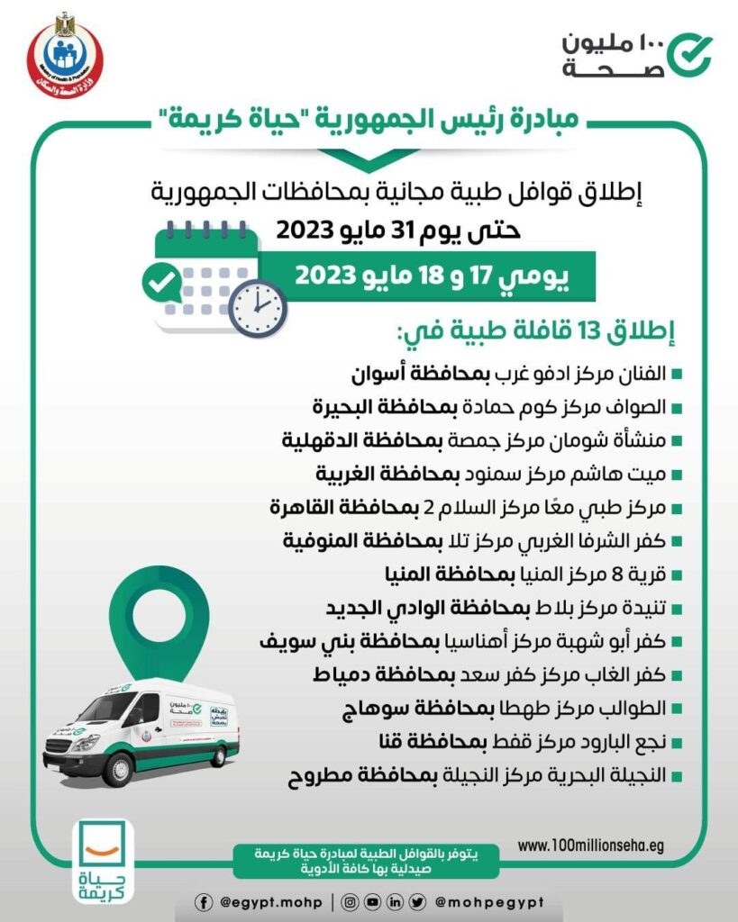 تطلق وزارة الصحة والسكان، اليوم وغدا 13 قافلة طبية ضمن مبادرة رئيس الجمهورية حياة كريمة للكشف والعلاج مجانًا فى التخصصات الطبية المختلفة.