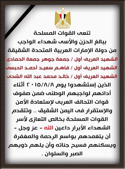 القوات المسلحة تنعي شهداء الواجب من دولة الامارات العربية المتجدة اثناء ادائهم الواجب الوطني ضمن صفوف قوات التحالف العربي لاستعادة الامن والاستقرار في دولة اليمن الشقيق