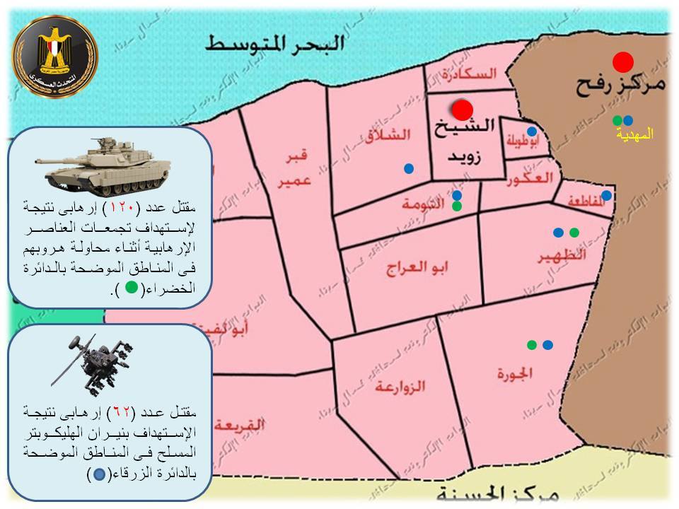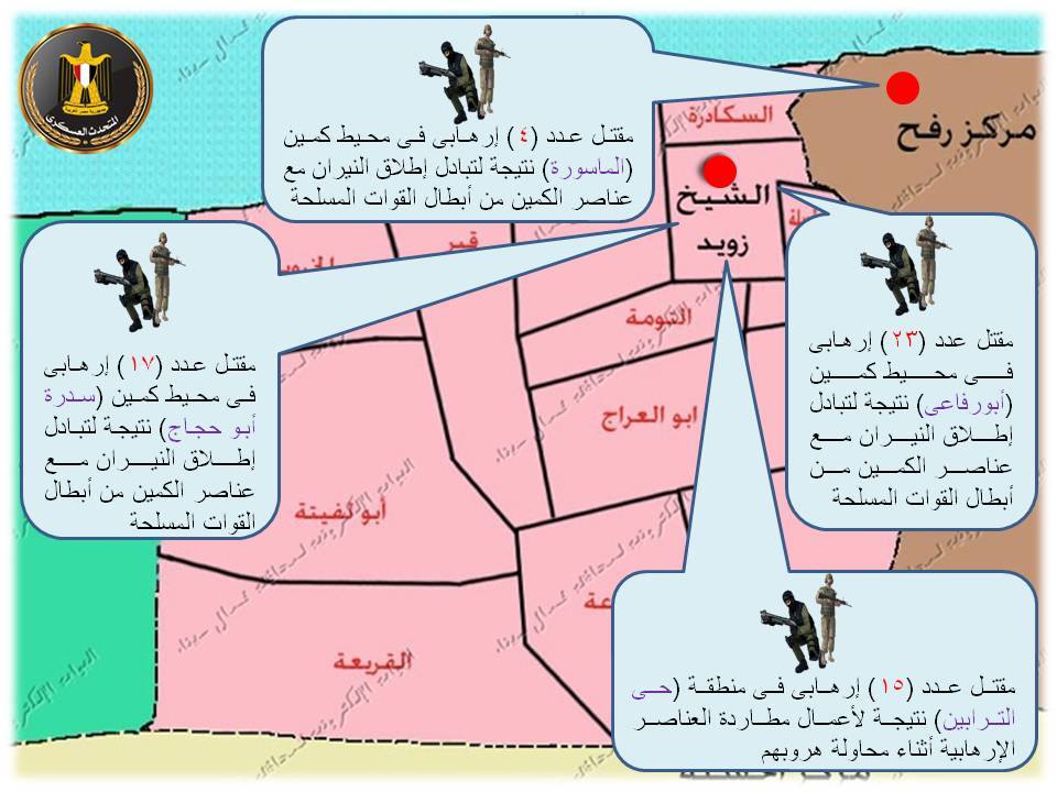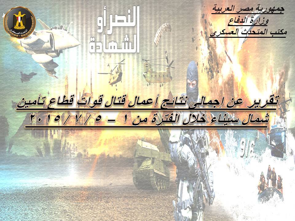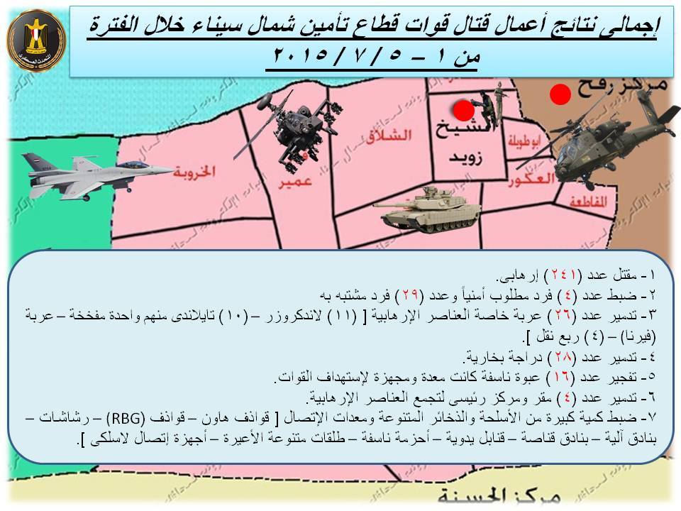 قال العميد محمد سمير المتحدث العسكرى إن إجمالى نتائج أعمال قتال قوات قطاع تأمين شمال سيناء خلال الخمسة أيام الماضية أسفرت عن مقتل (241) إرهابيا وضبط أربعة أفراد مطلوبين أمنيا وعدد (29) فرد مشتبه به وتدمير (26) عربة تخص العناصر الإرهابية ” (11) لاندكروزر / (10) تايلاندى منهم واحدة مفخخة / عربة (فيرنا) / (4) ربع نقل “.