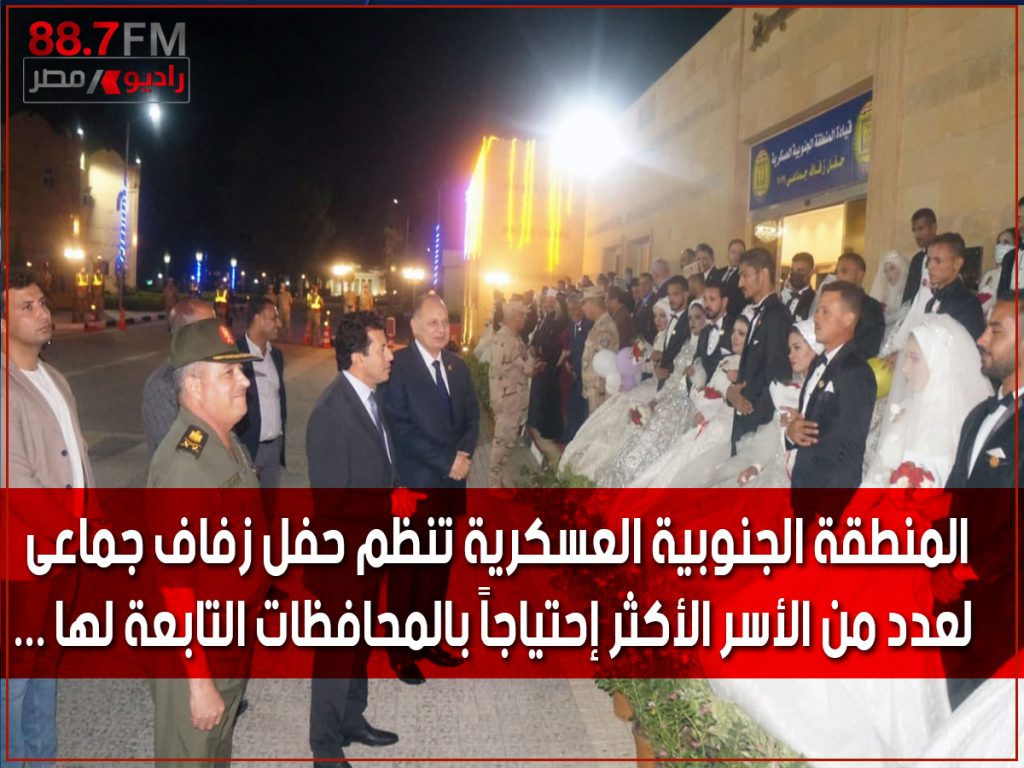 فى إطار حرص القيادة العامة للقوات المسلحة على دعم المجتمع المدنى ومساندة الأسر الأكثر إحتياجاً نظمت المنطقة الجنوبية العسكرية بالتعاون مع عدد من رجال الأعمال وبعض مؤسسات المجتمع المدنى حفل زفاف جماعى لعدد (110) شاب وفتاة على الملعب المكشوف بقيادة المنطقة الجنوبية العسكرية .