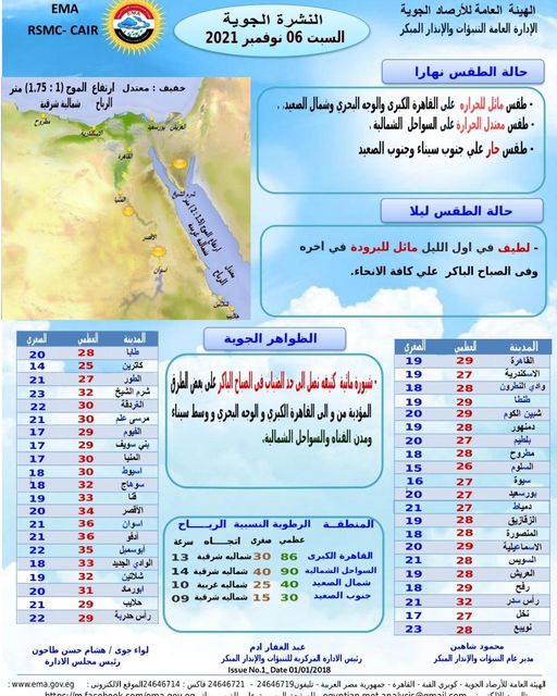 يتوقع خبراء هيئة الأرصاد الجوية أن تكون،اليوم السبت، حالة الطقس نهارا – معتدل – مائل للحرارة على القاهرة الكبرى والوجه البحري وشمال الصعيد – معتدل الحرارة على السواحل الشمالية – حار على جنوب سيناء وجنوب الصعيد ، ليلا – لطيف في أول الليل مائل للبرودة في آخره وفي الصباح الباكر على كافة الأنحاء .