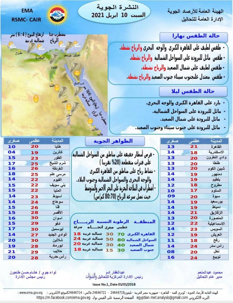 تتوقع هيئة الأرصاد الجوية أن يشهد اليوم السبت، انخفاض آخر فى درجات الحرارة على كافة الأنحاء، حيث يسود طقس لطيف على القاهرة الكبرى والوجه البحرى والرياح نشطة، مائل للبرودة على السواحل الشمالية والرياح نشطة، معتدل على جنوب سيناء ولطيف على شمال الصعيد والرياح نشطة، معتدل على جنوب الصعيد والرياح نشطة. وكشف محمود شاهين مدير إدارة التنبؤات الجوية بالهيئة العامة للأرصاد، أن البلاد تشهد نشاط رياح على مناطق من القاهرة الكبرى والوجه البحرى والسواحل الشمالية وجنوب البلاد، وفرص أمطار خفيفة على مناطق من السواحل الشمالية على فترات متقطعة، واضطراب فى الملاحة البحرية على البحر الأحمر والمتوسط، حيث تصل سرعة الرياح من 70 لـ80 كم فى الساعة. وعن حالة الطقس ليلا فيسود طقس بارد على القاهرة الكبرى والوجه البحرى، مائل للبرودة على السواحل الشمالية، لطيف على جنوب سيناء، مائل للبرودة على جنوب البلاد. وبالنسبة لدرجات الحرارة، اليوم السبت: القاهرة العظمى 21 درجة والصغرى 13 درجة، والإسكندرية العظمى 18 والصغرى 14 درجة، ومطروح العظمى 18 درجة والصغرى 12 درجة، وسوهاج العظمى 24 درجة والصغرى 14 درجة، وقنا العظمى 26 درجة والصغرى 15 درجة، وأسوان العظمى 30 درجة والصغرى 16 درجة