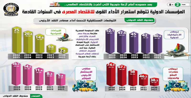 وفي هذا الصدد، نشر المركز الإعلامي لمجلس الوزراء، تقريراً تضمن إنفو جرافات تسلط الضوء على التوقعات المستقبلية للمؤسسات الدولية بشأن استمرار الأداء القوي للاقتصاد المصري في السنوات القادمة وذلك بعد صموده أمام أزمة كورونا التي أضرت بالاقتصاد العالمي.