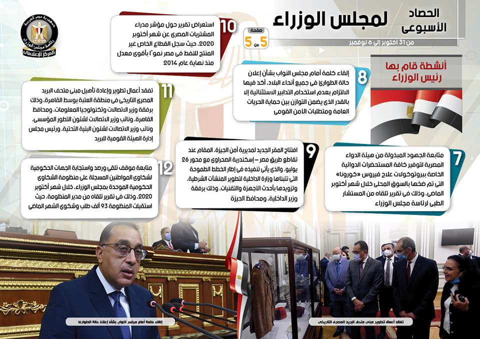 وبشأن الأنشطة التي قام بها السيد رئيس مجلس الوزراء، فبحسب التقرير، شملت زيارة سيادته إلى العاصمة العراقية بغداد على رأس وفد وزاري رفيع المستوى؛ وذلك للمشاركة في أعمال اللجنة العليا المصرية العراقية المشتركة، حيث كان في استقباله رئيس الوزراء العراقي بمقر مجلس الوزراء، بالإضافة إلى إلقاء كلمة في الجلسة الرئيسية لاجتماعات اللجنة العليا المصرية العراقية المشتركة ببغداد، حيث نقل توجيهات الرئيس السيسي بالعمل على دعم العلاقات الثنائية بين البلدين الشقيقين، وأشاد بالتوافق بشأن أهمية إنشاء آلية النفط مقابل الإعمار من خلال قيام الشركات المصرية بتنفيذ مشروعات تنموية في العراق مقابل كميات النفط التي سوف تستوردها مصر، وكذلك شهد سيادته مع رئيس الوزراء العراقي، بمقر مجلس الوزراء، مراسم توقيع 15 اتفاقية ومذكرة تفاهم وبروتوكول تعاون بهدف تعزيز التعاون الثنائي المشترك بين البلدين، بالإضافة إلى إلقاء كلمة أمام منتدى الأعمال المصري العراقي “معا لإعادة الإعمار والتعاون الثلاثي”، استعرض فيها أهم محاور التعاون مع الأشقاء بالعراق، وذلك بحضور رئيس الوزراء العراقي، وعدد من وزراء البلدين، وبمشاركة عدد من رجال الأعمال والصناعة من البلدين، فضلاً عن عقد مؤتمر صحفي مشترك بمقر مجلس الوزراء العراقي، حيث شدد على مصالح الدولتين في الحفاظ على حقوقهما المائية باعتباره أمراً يمس الأمن القومي العربي، وكذا على وجود توجيه للوزراء بوضع خطة زمنية محددة، لتفعيل وتنفيذ مذكرات التفاهم، وتحويلها لمشروعات تخدم مصالح الشعبين، وكذلك إلقاء كلمة أمام مجلس النواب بشأن إعلان حالة الطوارئ في جميع أنحاء البلاد، أكد فيها الالتزام بعدم استخدام التدابير الاستثنائية إلا بالقدر الذى يضمن التوازن بين حماية الحريات العامة ومتطلبات الأمن القومي، فضلاً عن متابعة الجهود المبذولة من هيئة الدواء المصرية لتوفير كافة المستحضرات الدوائية الخاصة ببروتوكولات علاج فيروس “كورونا” التي تم ضخها بالسوق المحلى خلال شهر أكتوبر الماضي، وذلك في تقرير تلقاه من المستشار الطبي لرئاسة مجلس الوزراء، كما شملت الأنشطة أيضاً، استعراض رئيس مجلس الوزراء تقرير بشأن مؤشر مدراء المشتريات المصري عن شهر أكتوبر 2020، حيث سجل القطاع الخاص غير المنتج للنفط في مصر نموًا بأقوى معدل منذ نهاية عام 2014، بالإضافة إلى تفقد أعمال تطوير وإعادة تأهيل مبنى متحف البريد المصري التاريخي في منطقة العتبة بوسط القاهرة، وذلك برفقة وزير الاتصالات وتكنولوجيا المعلومات، ومحافظ القاهرة، ونائب وزير الاتصالات لشئون التطور المؤسسي، ونائب وزير الاتصالات لشئون البنية التحتية، ورئيس مجلس إدارة الهيئة القومية للبريد، كما افتتح سيادته المقر الجديد لمديرية أمن الجيزة، المقام عند تقاطع طريق مصر – إسكندرية الصحراوي مع محور 26 يوليو، والذى يأتي تنفيذه في إطار الخطط الطموحة التي تتبناها وزارة الداخلية لتطوير المنشآت الشرطية، وتزويدها بأحدث الأجهزة والتقنيات، وذلك برفقة وزير الداخلية، ومحافظ الجيزة، وكذلك متابعة مع المشرف العام على مشروع مجمع الإصدارات المؤمنة والذكية المُقام على طريق القاهرة – السخنة، مستجدات العمل بالمشروع والموقف النهائي لمراحله التنفيذية؛ تمهيداً لافتتاحه رئاسيا، فضلا عن متابعة موقف تلقي ورصد واستجابة الجهات الحكومية لشكاوى المواطنين المسجلة على منظومة الشكاوى الحكومية الموحدة بمجلس الوزراء، خلال شهر أكتوبر 2020، وذلك في تقرير تلقاه من مدير المنظومة، حيث استقبلت المنظومة 93 ألف طلب وشكوى الشهر الماضي.