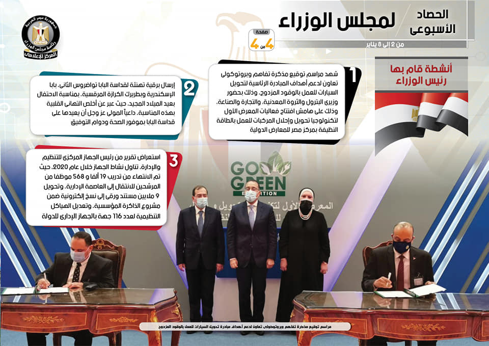 وبشأن الأنشطة التي قام بها السيد رئيس مجلس الوزراء، فبحسب التقرير، شملت شهد سيادته مراسم توقيع مذكرة تفاهم وبروتوكولي تعاون لدعم أهداف المبادرة الرئاسية لتحويل السيارات للعمل بالوقود المزدوج، وذلك بحضور وزيري البترول والثروة المعدنية، والتجارة والصناعة، وذلك على هامش افتتاح فعاليات المعرض الأول لتكنولوجيا تحويل وإحلال المركبات للعمل بالطاقة النظيفة بمركز مصر للمعارض الدولية.