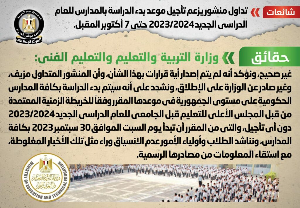 نفي المركز الإعلامي لمجلس الوزراء اليوم الخميس ما انتشر من أنباء تزعم تأجيل موعد بدء الدراسة بالمدارس للعام الدراسي الجديد 2023/2024 حتى 7 أكتوبر المقبل .