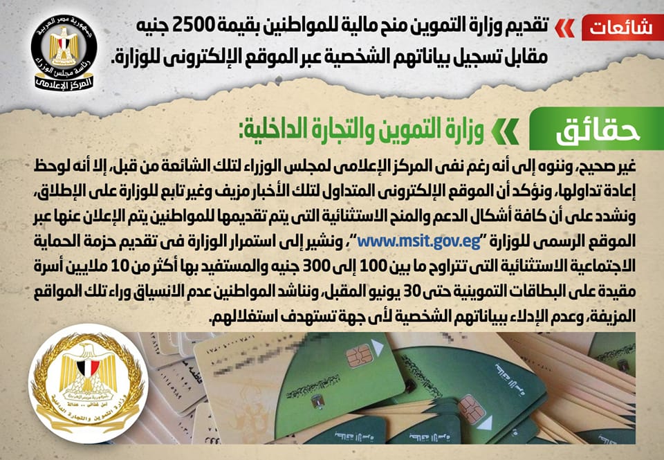 بالإنفوجراف.. الحكومة تنفي تقديم “التموين” منح مالية للمواطنين بقيمة 2500 جنيه مقابل تسجيل بياناتهم الشخصية