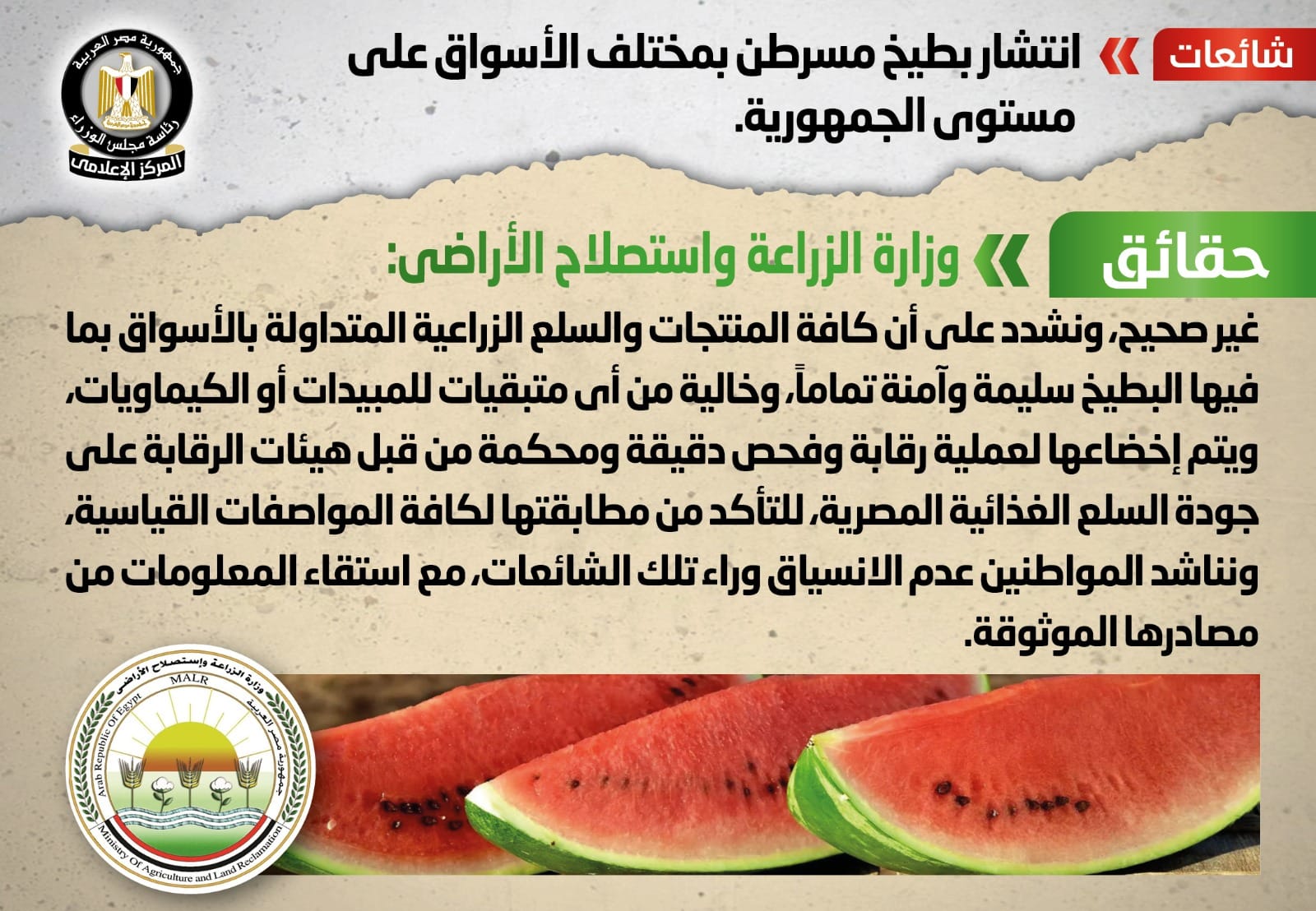 وقال المركز، في بيان اليوم، إنه بالتواصل مع وزارة الزراعة واستصلاح الأراضي، والتي نفت تلك الأنباء، مُؤكدةً أنه لا صحة لانتشار بطيخ مسرطن بأي من الأسواق على مستوى الجمهورية، مُشددةً على أن كافة المنتجات والسلع الزراعية المتداولة بالأسواق بما فيها البطيخ سليمة وآمنة تماماً، وخالية من أي متبقيات للمبيدات أو الكيماويات، ويتم إخضاعها لعملية رقابة وفحص دقيقة ومحكمة من قبل هيئات الرقابة على جودة السلع الغذائية المصرية، للتأكد من مطابقتها لكافة المواصفات القياسية، مناشدةً المواطنين عدم الانسياق وراء تلك الشائعات، مع استقاء المعلومات من مصادرها الموثوقة.