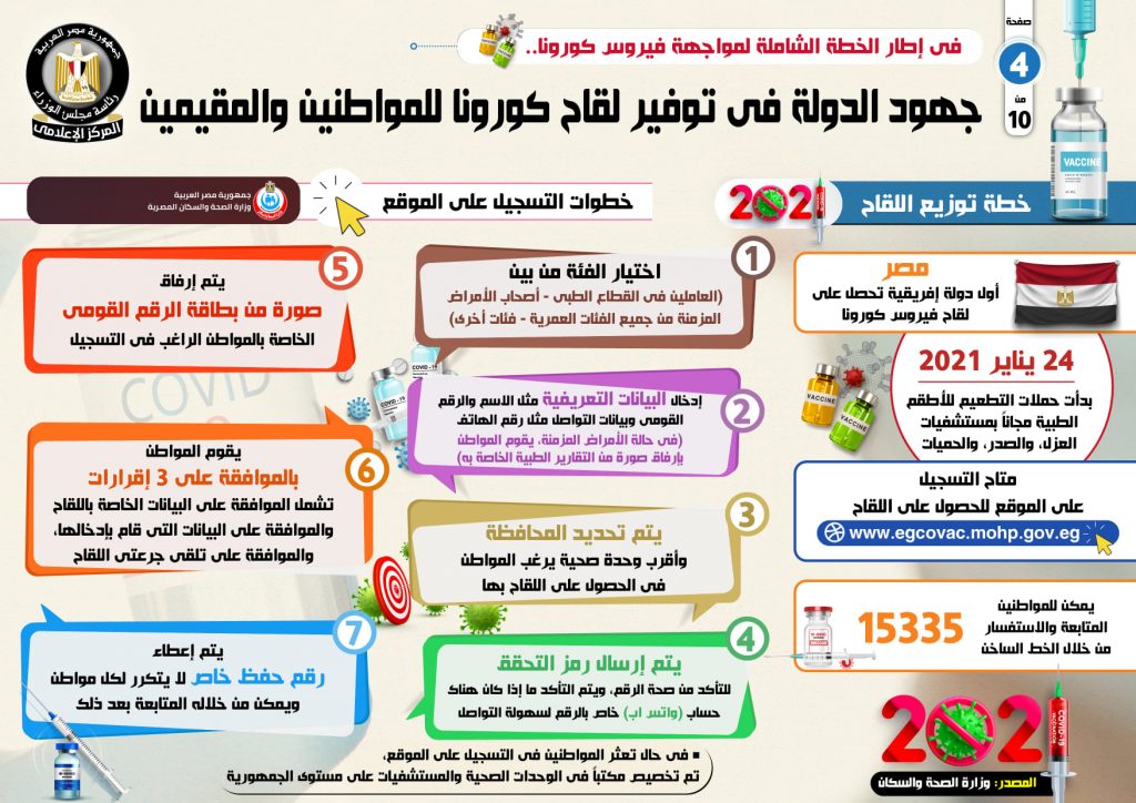 وأشار التقرير إلى أن التسجيل على الموقع الإلكتروني الخاص بالحصول على اللقاح، أصبح متاحاً للفئات المستحقة على الرابط التالي (www.egcovac.mohp.gov.eg)، كما يمكن للمواطنين المتابعة والاستفسار من خلال الخط الساخن 15335.