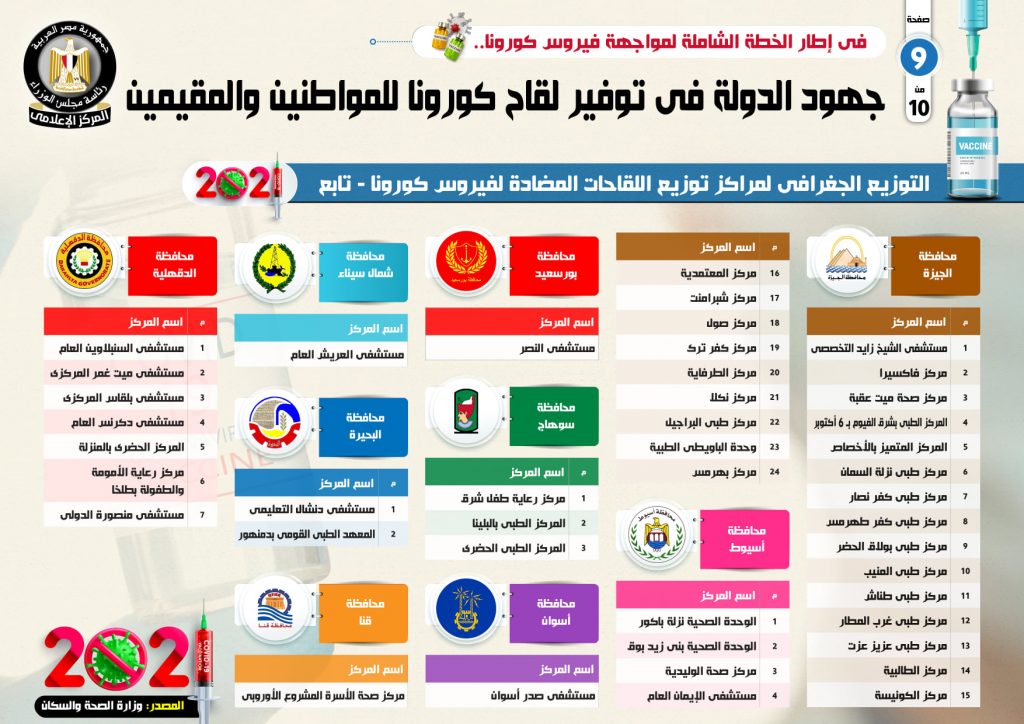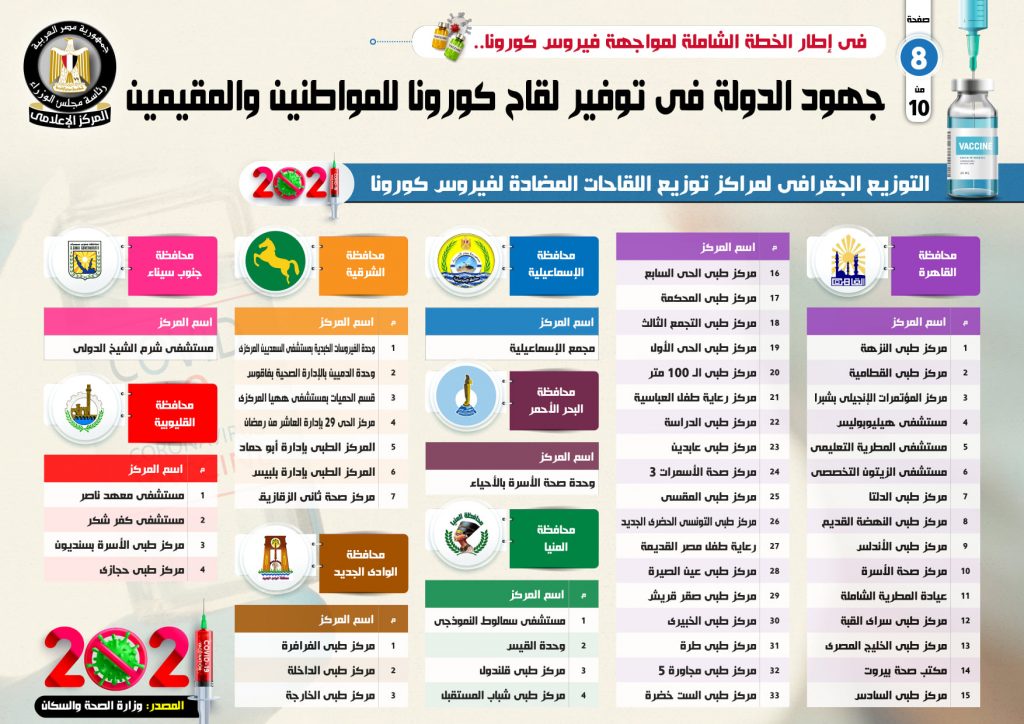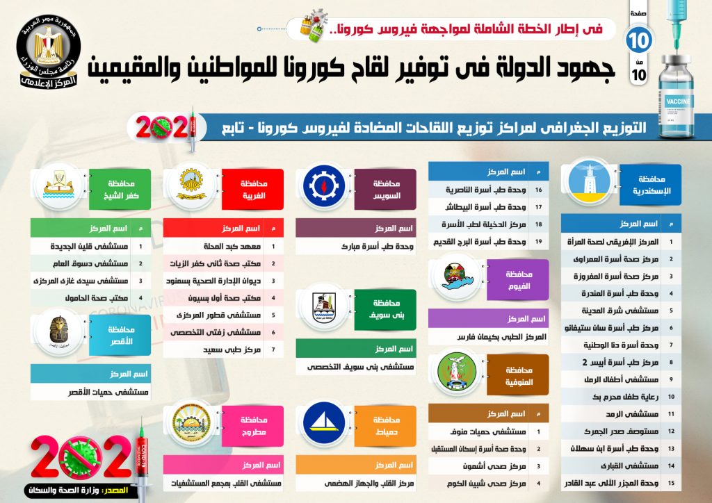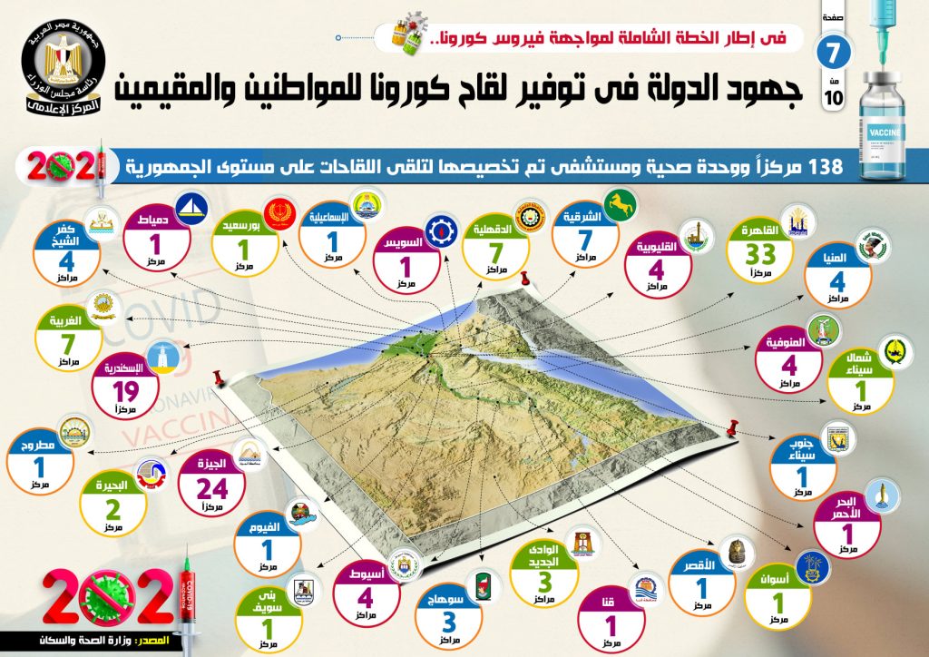 وأشار التقرير إلى وجود 138 مركزاً ووحدة صحية ومستشفى تم تخصيصها لتلقى اللقاحات على مستوى الجمهورية، بواقع 33 مركزا في محافظة القاهرة وتتمثل في (مركز طبي النزهة، مركز طبي القطامية، مركز المؤتمرات الإنجيلي بشبرا، مستشفى هيليوبوليس، مستشفى المطرية التعليمي، مستشفى الزيتون التخصصي، مركز طبي الدلتا، مركز طبي النهضة القديم، مركز طبي الأندلس، مركز صحة الأسرة، عيادة المطرية الشاملة، مركز طبي سراي القبة، مركز طبي الخليج المصري، مكتب صحة بيروت، مركز طبي السادس).