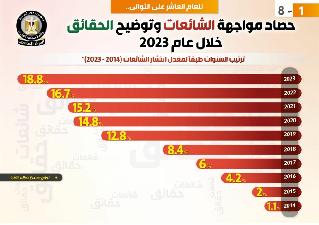 وكشف التقرير عن ترتيب السنوات طبقاً لمعدل انتشار الشائعات منذ عام 2014 حتى عام 2023، وفقاً لتوزيع نسبي لإجمالي الفترة، حيث بلغ 18.8% عام 2023، و16.7% عام 2022، و15.2% عام 2021، و14.8% عام 2020، و12.8% عام 2019، و8.4% عام 2018، و6% عام 2017، و4.2% عام 2016، و2% عام 2015، و1.1% عام 2014.