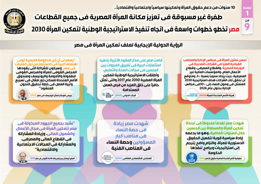وفي هذا الصدد نشر المركز الإعلامي لمجلس الوزراء تقريراً تضمن إنفوجرافات تسلط الضوء على الطفرة غير المسبوقة في تعزيز مكانة المرأة المصرية في جميع القطاعات، وخطوات مصر الواسعة في اتجاه تنفيذ الاستراتيجية الوطنية لتمكين المرأة 2030، وذلك بعد 10 سنوات من دعم حقوق المرأة وتمكينها سياسياً واجتماعياً واقتصادياً.