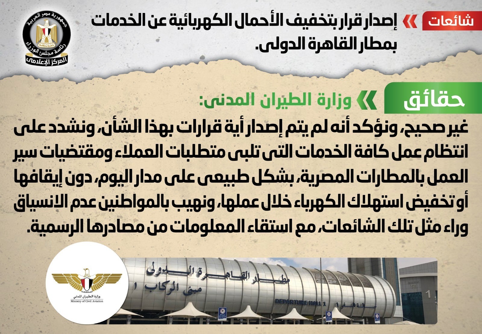 بالإنفوجراف.. مجلس الوزراء ينفي إصدار قرار بتخفيف الأحمال الكهربائية عن الخدمات بمطار القاهرة الدولي