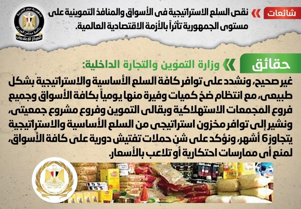 نفى المركز الإعلامي لمجلس الوزراء ما انتشر في بعض المواقع الإلكترونية وصفحات التواصل الاجتماعي من أنباء بشأن نقص السلع الاستراتيجية في الأسواق والمنافذ التموينية على مستوى الجمهورية تأثراً بالأزمة الاقتصادية العالمية، وقد قام المركز الإعلامي لمجلس الوزراء بالتواصل مع وزارة التموين والتجارة الداخلية، والتي نفت تلك الأنباء، مُؤكدةً أنه لا صحة لوجود نقص في السلع الاستراتيجية في الأسواق والمنافذ التموينية، مُشددةً على توافر كافة السلع الأساسية والاستراتيجية بشكل طبيعي، مع انتظام ضخ كميات وفيرة منها يومياً بكافة الأسواق وجميع فروع المجمعات الاستهلاكية وبقالي التموين وفروع مشروع جمعيتي، مُشيرةً إلى توافر مخزون استراتيجي من السلع الأساسية والاستراتيجية يتجاوز 6 أشهر، مؤكدةً على شن حملات تفتيش دورية على كافة الأسواق، لمنع أي ممارسات احتكارية أو تلاعب بالأسعار.