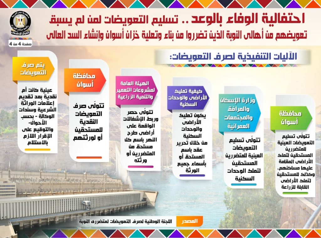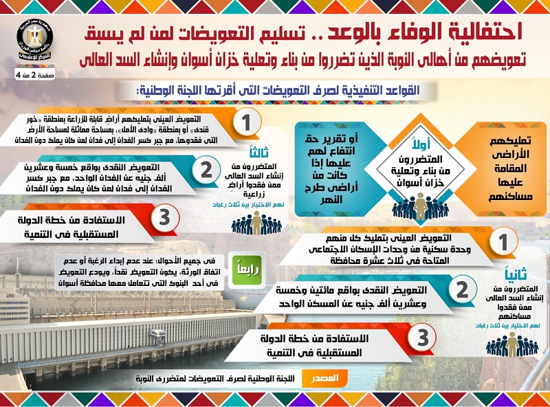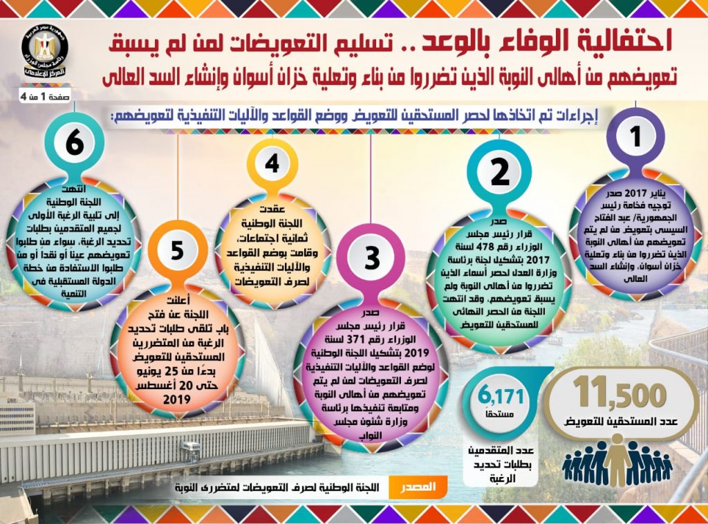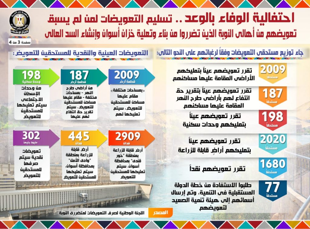 نشر المركز الاعلامى لمجلس الوزراء على الصفحة الرسمية لمجلس الوزراء على الفيسبوك انفوجراف عن احتفالية الوفاء بالوعد … تسليم التعويضات لمن لم يسبق تعويضهم من أهالي النوبة الذين تضرروا من بناء وتعلية خزان أسوان وإنشاء السد العالي