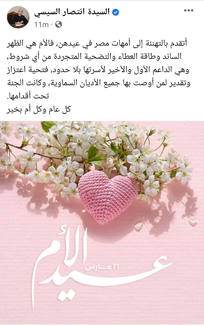 وهنأت السيدة انتصار السيسي، في تدوينة على صفحتها الرسمية على مواقع التواصل الاجتماعي، أمهات مصر في عيدهن، وقالت “إن الأم هي الظهر الساند وطاقة العطاء والتضحية المتجردة من أي شروط، وهي الداعم الأول والأخير لأسرتها بلا حدود، فتحية اعتزاز وتقدير لمن أوصت بها جميع الأديان السماوية، وكانت الجنة تحت أقدامها.. كل عام وكل أم بخير”.
