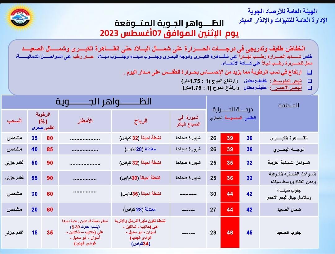 وبالنسبة لحالة البحر المتوسط فتكون خفيفة إلى معتدلة وارتفاع الموج فيه من متر إلى 1.75 متر والرياح السطحية شمالية غربية.. أما بالنسبة لحالة البحر الأحمر فتكون خفيفة إلى معتدلة وارتفاع الموج فيه من متر إلى 1.75 متر والرياح السطحية شمالية غربية.