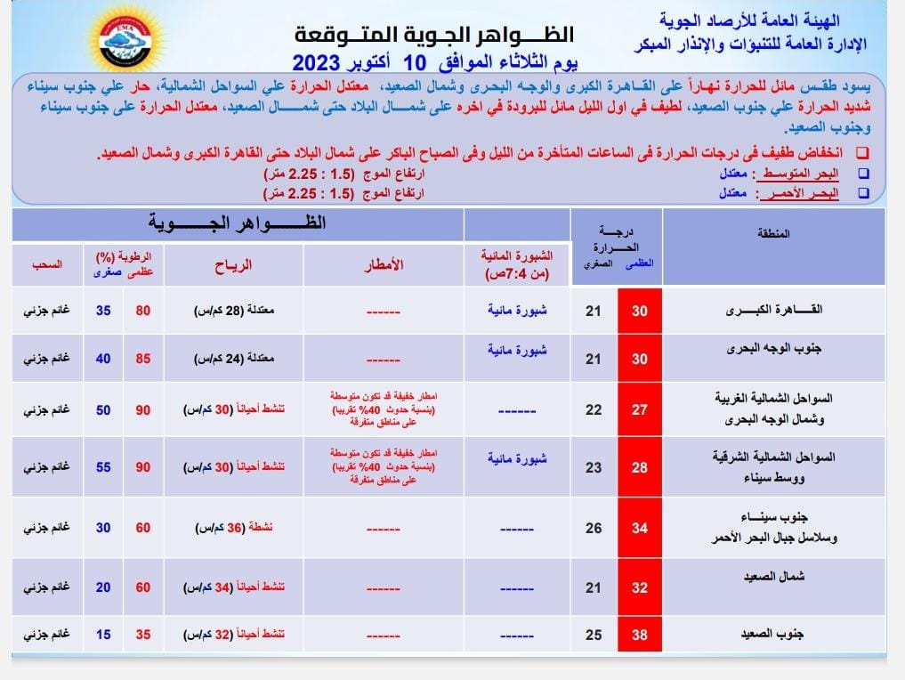 يتوقع خبراء هيئة الأرصاد الجوية أن يسود- الثلاثاء- طقس مائل للحرارة نهارًا على القاهرة الكبرى والوجه البحري وشمال الصعيد، معتدلًا على السواحل الشمالية حارًا على جنوب سيناء شديد الحرارة على وجنوب الصعيد، وأن يكون الطقس لطيفًا في أول الليل مائلًا للبرودة في آخره على شمال البلاد حتى شمال الصعيد، معتدل الحرارة على جنوب سيناء وجنوب الصعيد.