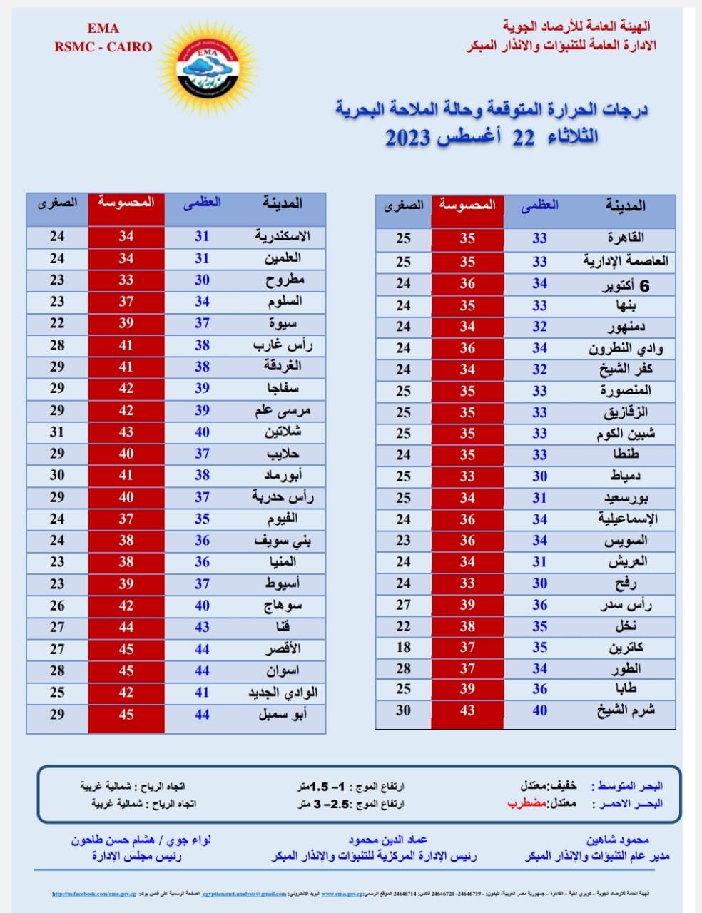 وبالنسبة لحالة البحر الأحمر تكون معتدلة إلى مضطربة وارتفاع الموج من 2.5 متر إلى ثلاثة أمتار والرياح السطحية شمالية غربية.