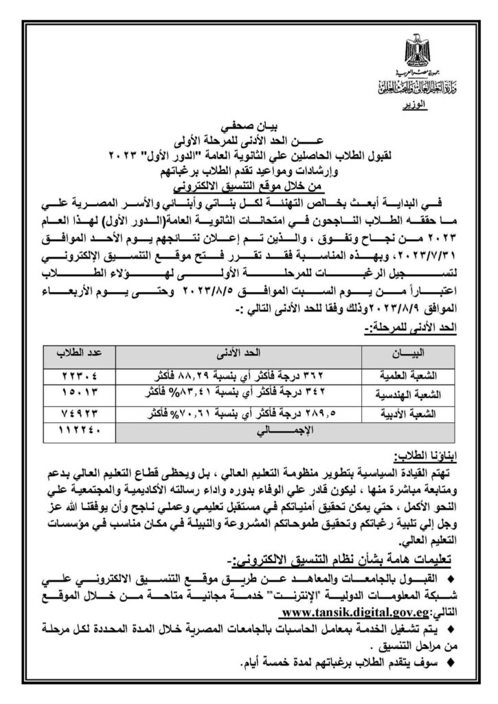 وذكر بيان صادر اليوم عن وزارة التعليم العالي والبحث العلمي أن القبول بالجامعات والمعاهد سيكون عن طريق موقع التنسيق الإلكتروني علي شبكة المعلومات الدولية “الإنترنت” خدمة مجانية متاحة من خلال الموقع التالي: www.tansik.digital.gov.eg.