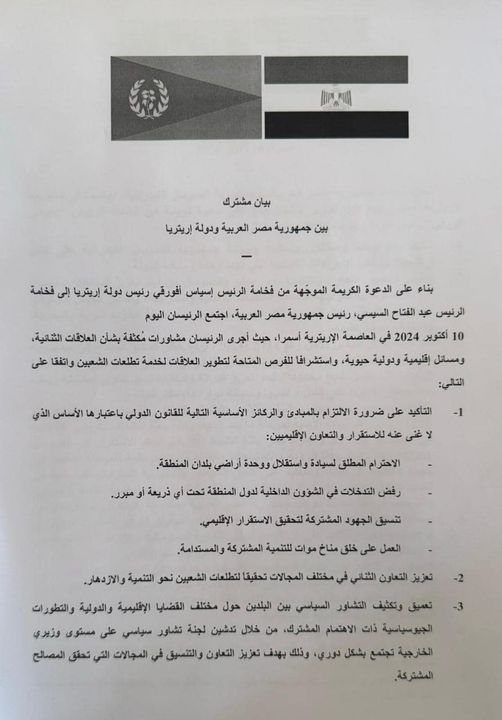 وجاء في البيان المشترك الصادر اليوم عقب مشاورات مكثفة، جرت بين الرئيسين بالعاصمة الإريترية أسمرا، بشأن العلاقات الثنائية ومسائل إقليمية ودولية حيوية، واستشرافاً للفرص المتاحة لتطوير العلاقات لخدمة تطلعات الشعبين، وذلك بناء على الدعوة الموجهة من الرئيس أسياس أفورقي إلى الرئيس عبد الفتاح السيسي.