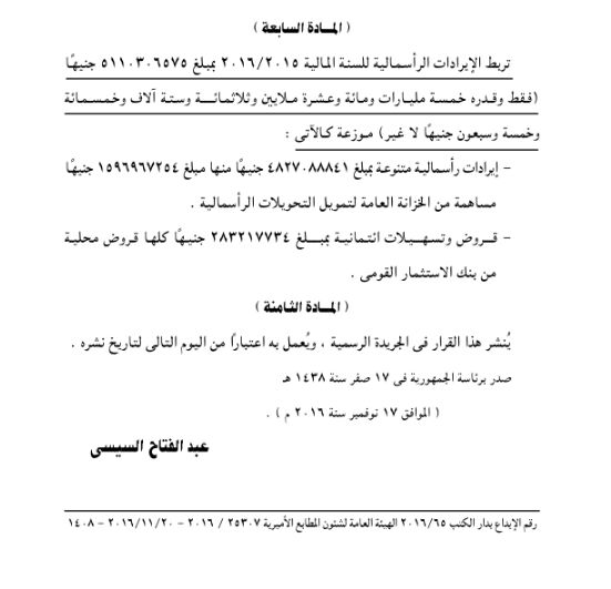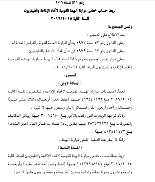 ونشرت الجريدة الرسمية، القرار رقم 516 لسنة 2016 بربط حساب ختامى موازنة الهيئة القومية لاتحاد الإذاعة والتليفزيون للسنة المالية 2015 / 2016 .