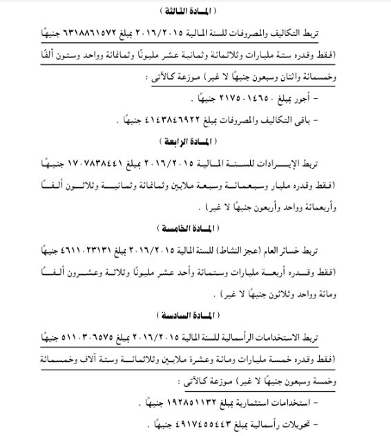 وذكرت المادة الأولى: تُعدل اعتمادات موازنة الهيئة القومية لاتحاد الإذاعة والتليفزيون للسنة المالية 2015 / 2016 بمبلغ 413541572 جنيها، وذلك لمواجهة الزيادات التى وقعت بالأجور بمبلغ 30014650 جنيها وبباقى التكاليف والمصروفات بمبلغ 383526922 جنيها مقابل زيادة اعتمادات خسائر العام (عجز النشاط) بمبلغ 413541572 جنيها، وفقا لما أسفر عنه التنفيذ الفعلى لموازنة الهيئة.