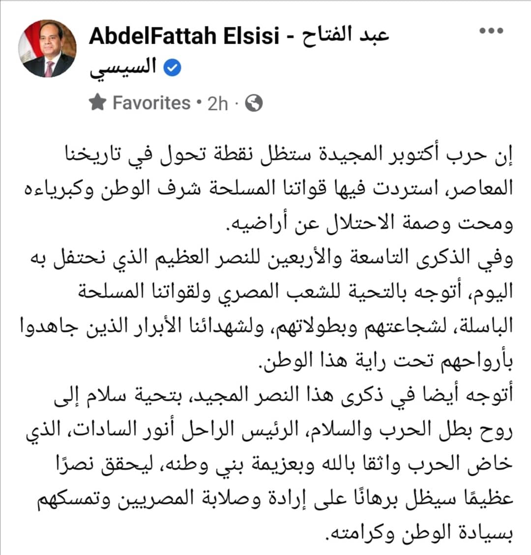 وتابع الرئيس السيسي “وفي الذكرى التاسعة والأربعين للنصر العظيم، الذي نحتفل به اليوم، أتوجه بالتحية للشعب المصري ولقواتنا المسلحة الباسلة، لشجاعتهم وبطولاتهم، ولشهدائنا الأبرار الذين جاهدوا بأرواحهم تحت راية هذا الوطن”.