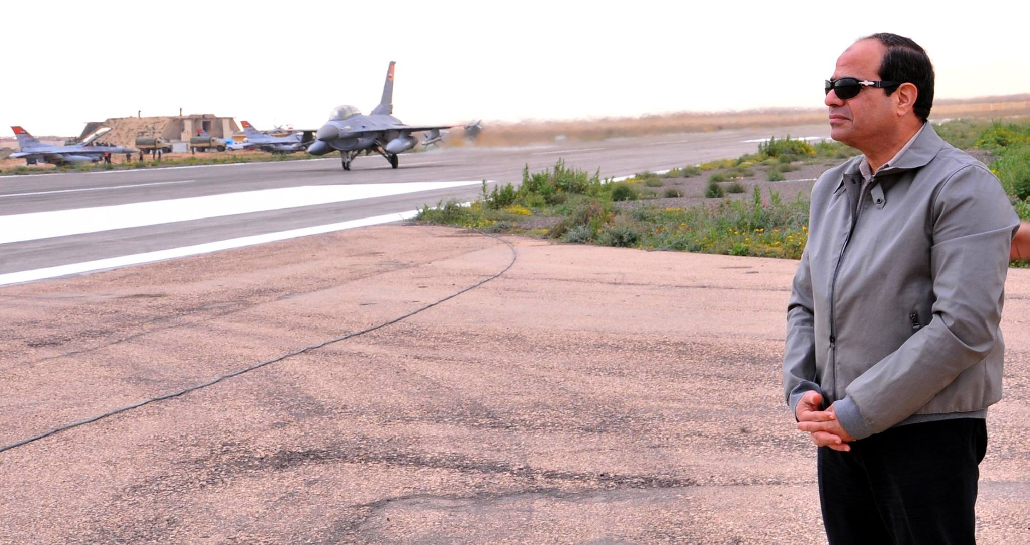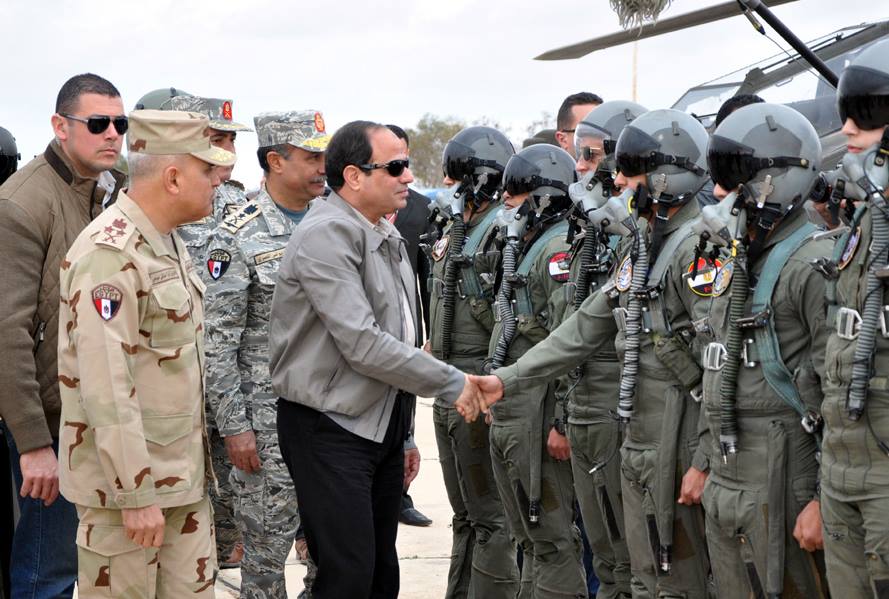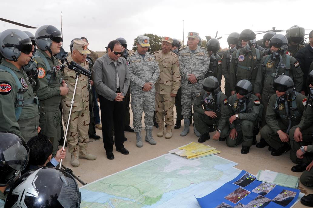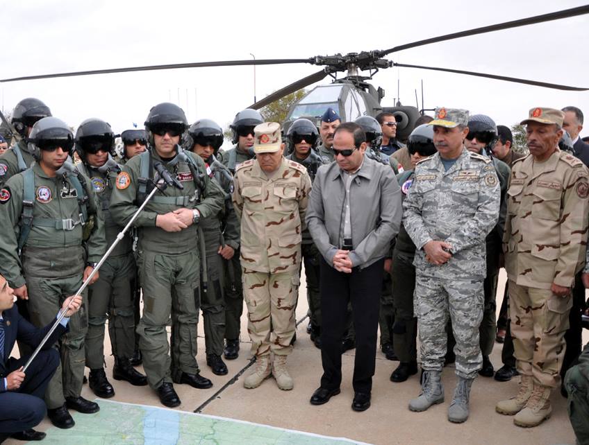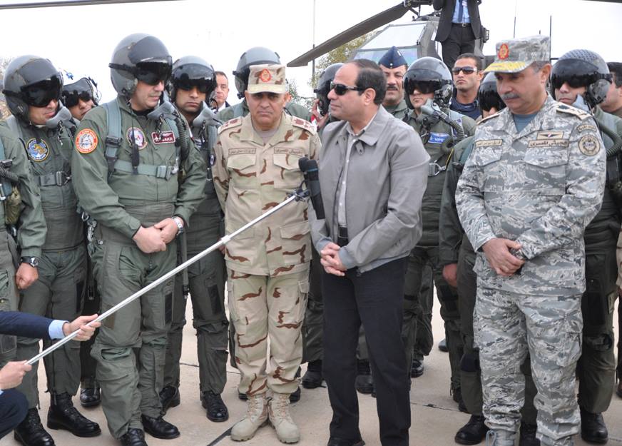 تفقد الرئيس عبد الفتاح السيسى رئيس الجمهورية القائد الأعلى للقوات المسلحة يرافقه الفريق أول صدقى صبحى القائد العام للقوات المسلحة وزير الدفاع والإنتاج الحربى صباح اليوم إحدى القواعد الجوية بنطاق المنطقة الغربية العسكرية لمتابعة اجراءات تأمين القوات للحدود على الإتجاه الإستراتيجى الغربى .