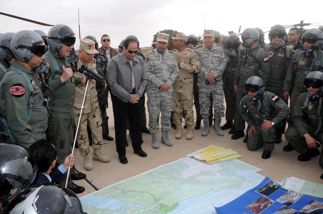 وناقش الرئيس السيسى عدداً من الطيارين والأطقم التخصصية والمعاونة فى أسلوب تنفيذ المهام المخططة والطارئة التى تنفذها القوات الجوية لتأمين الحدود ضد عمليات التسلل والتهريب والتصدى لمخاطر التنظيمات الإرهابية المسلحة عبر الحدود ، وأشاد بما لمسه من مستوى متميز وإحترافية عالية تعكس مستوى الكفاءة والإستعداد القتالى لقواتنا الجوية.