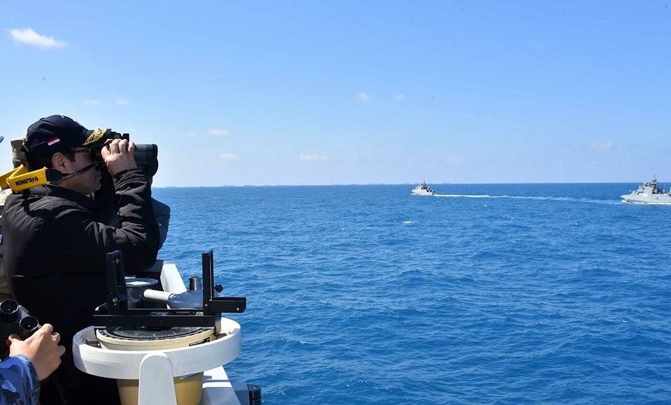شهد السيد الرئيس عبدالفتاح السيسي صباح اليوم ، فعاليات المناورة البحرية بالذخيرة الحية “ذات الصواري” التي ينفذها عدد كبير من القطع البحرية من مختلف الطرازات، وعلي رأسها الفرقاطة “تحيا مصر” وباشتراك عناصر من الوحدات الخاصة البحرية وطائرات اكتشاف ومكافحة الغواصات.
