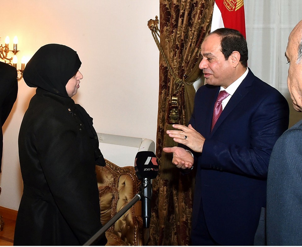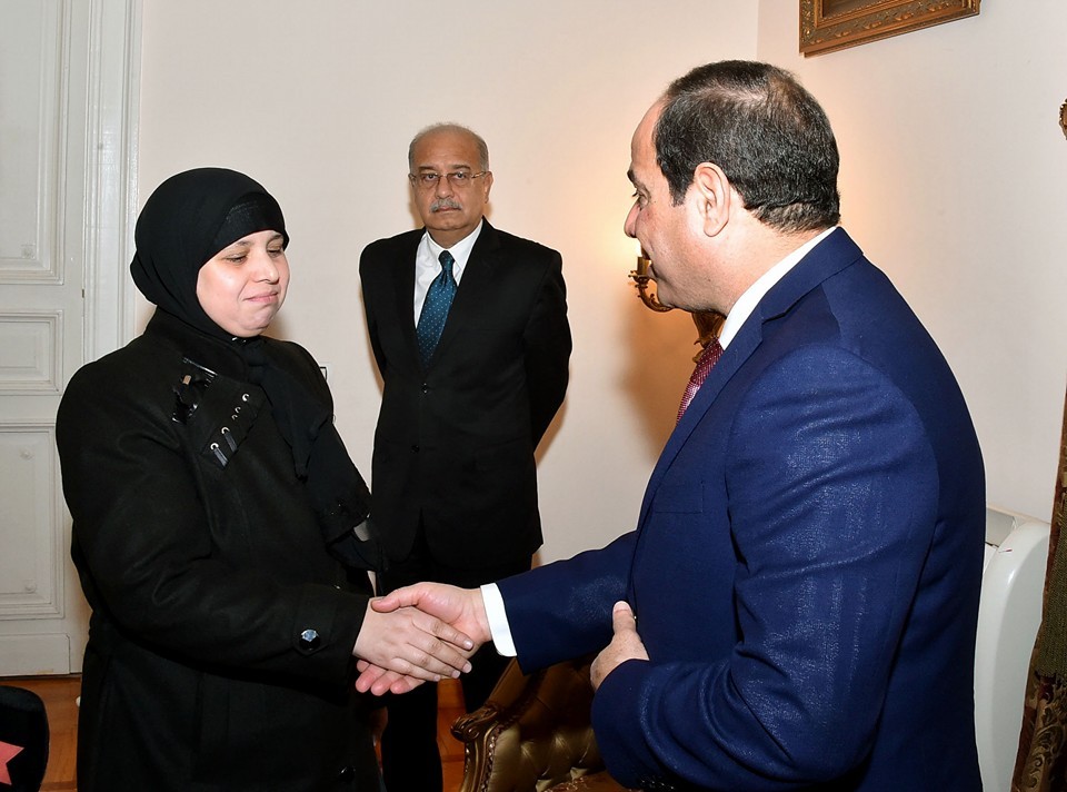 وأضاف المتحدث الرسمي أن السيد الرئيس استقبل أرملة الشهيد/ عمر حماد المستشار بمجلس الدولة، ووالد الشهيد/ عمرو مصطفى وكيل النائب العام، اللذين استشهدا جراء الحادث الإرهابي بمدينة العريش أثناء أدائهما لواجبهما الوطني في مراقبة الانتخابات البرلمانية، حيث أكد السيد الرئيس أن الشهيدين ضحيا بحياتهما في سبيل الوطن، وأضافا علامة مضيئة إلى مسيرة عطاء مؤسسة القضاء الشامخة ورجالها الأوفياء من أجل الوطن، اتصالاً بدورهم الهام في إنفاذ سيادة القانون وتحقيق العدالة.
