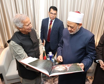 ومن جانبه، أكَّد فضيلة الإمام الأكبر اعتزاز الأزهر بعلاقاته التاريخية مع بنجلاديش، وسعيه لتعزيزها من خلال استقبال الطلاب الوافدين للدراسة في مختلف المراحل التعليمية في الأزهر، مؤكدًا استعداد الأزهر لزيادة المنح الدراسية المخصصة لالتحاق أبناء بنجلاديش بجامعة الأزهر، وتوجيهها لدراسة المجالات التي تُلبِّي رغبات الشعب البنجلاديشي وتطلعاتهم، داعيًا المولى عزَّ وجلَّ أن يوفِّق محمد يونس، في مهمة العبور ببنجلاديش إلى بر الأمان، وبسط الاستقرار، ونشر الأمن والأمان.